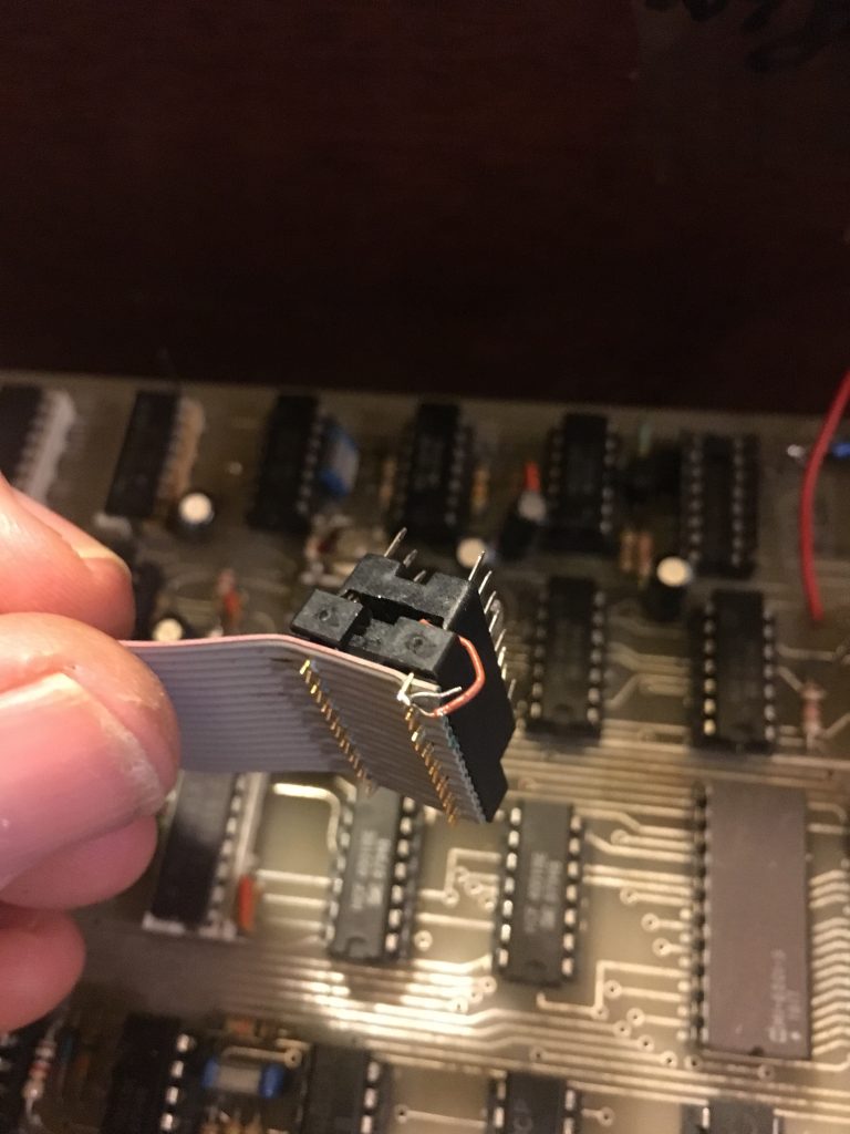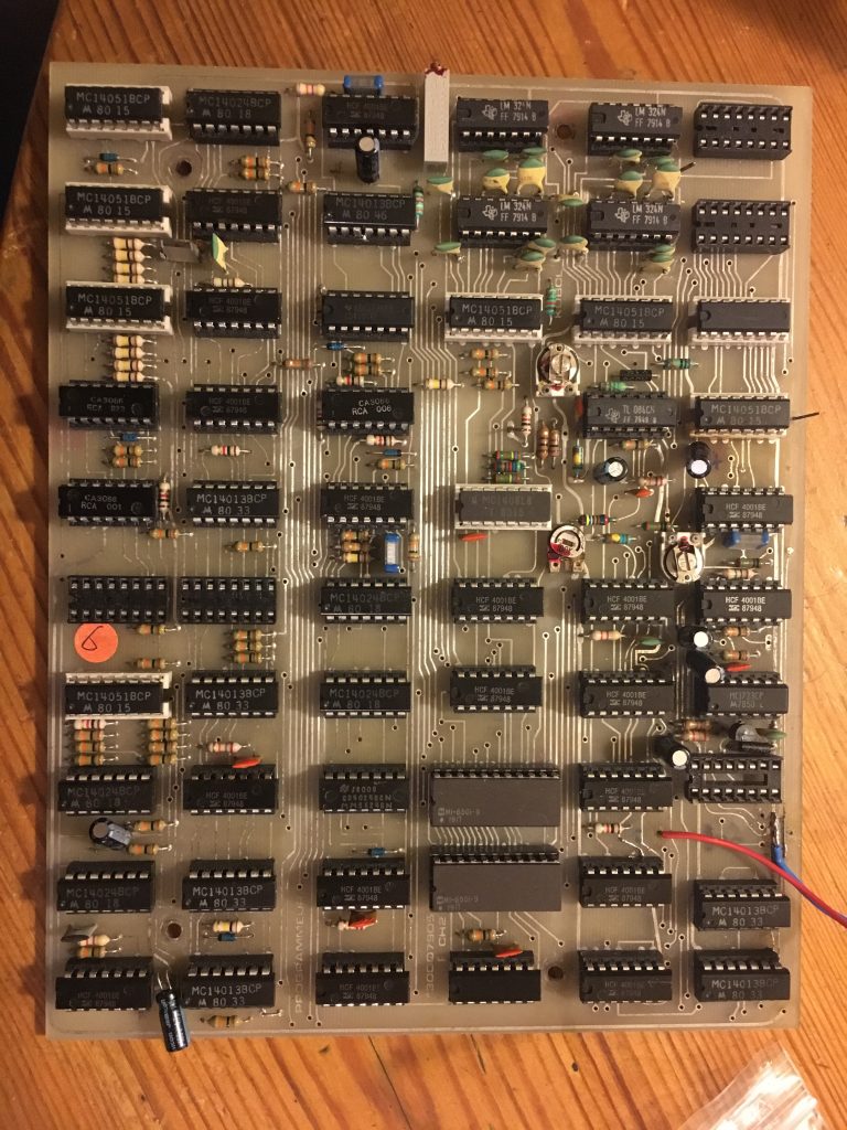 ….On Programmer PCB – 3x Caps, 3x LM324 Op-Amps, LM723 Rectifier, 3x IC Sockets, Transistor, Ribbon Cable Connector.